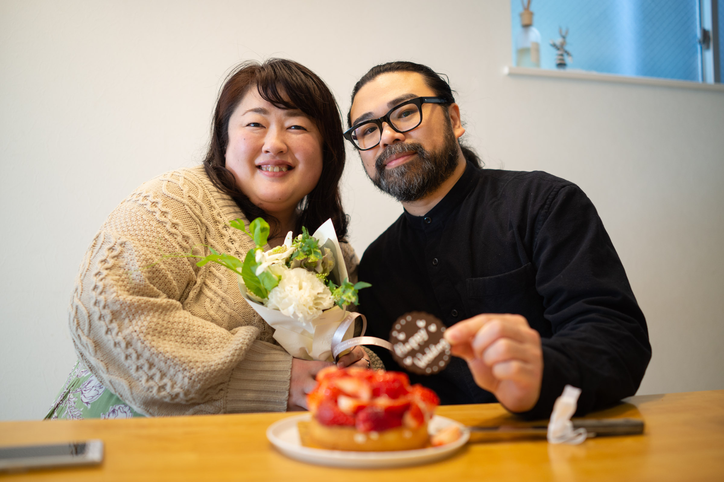 サプライズでもらったMINOLIちゃんのお誕生日ケーキ。2枚目の写真はお友達が結婚を祝ってくれた時の写真です。