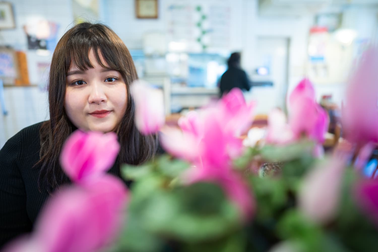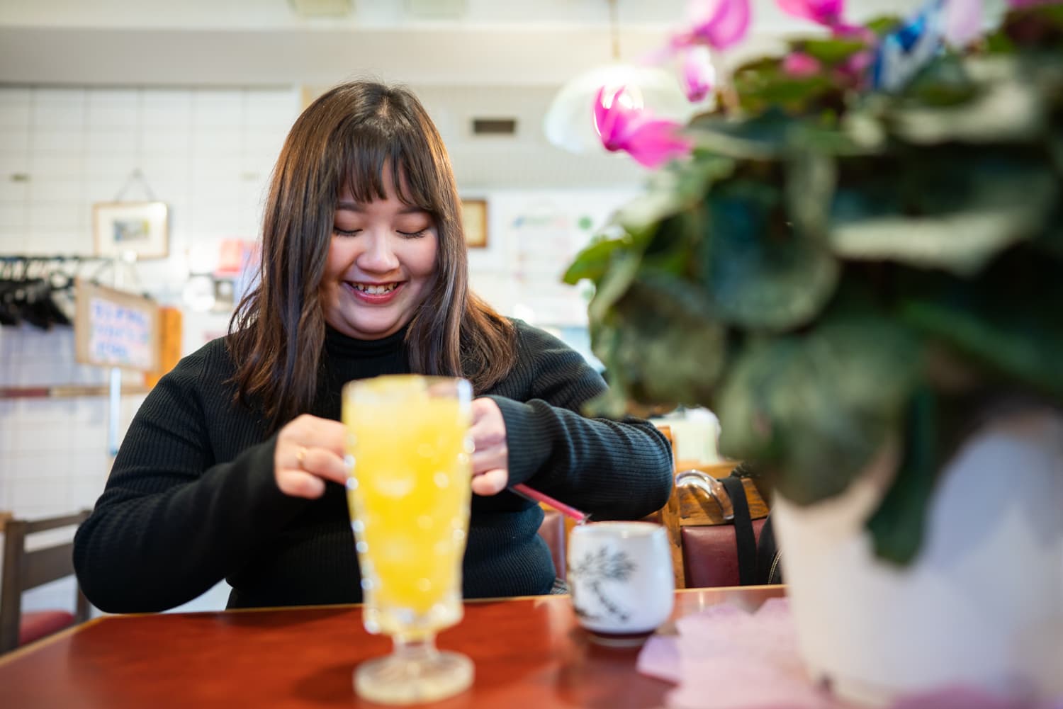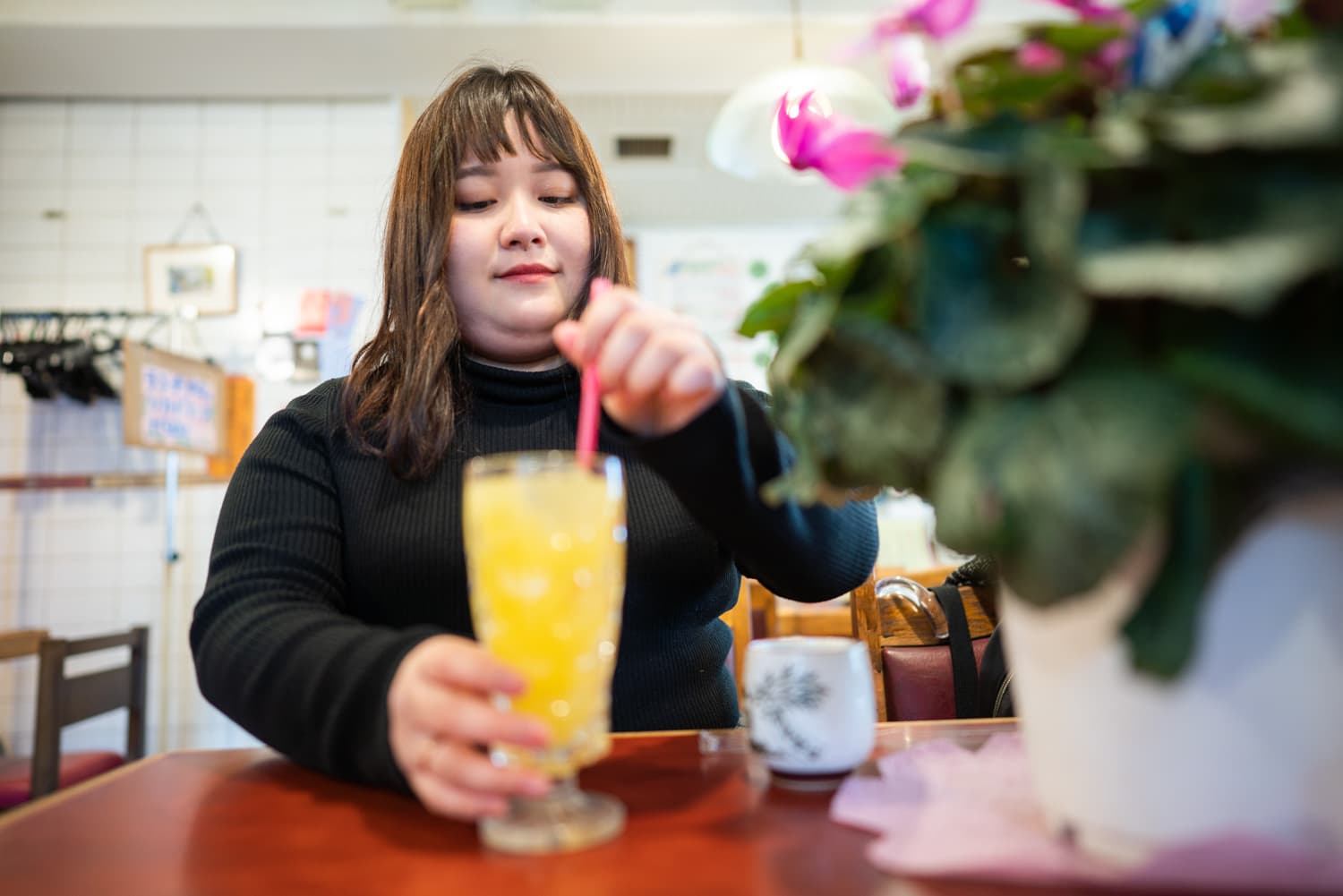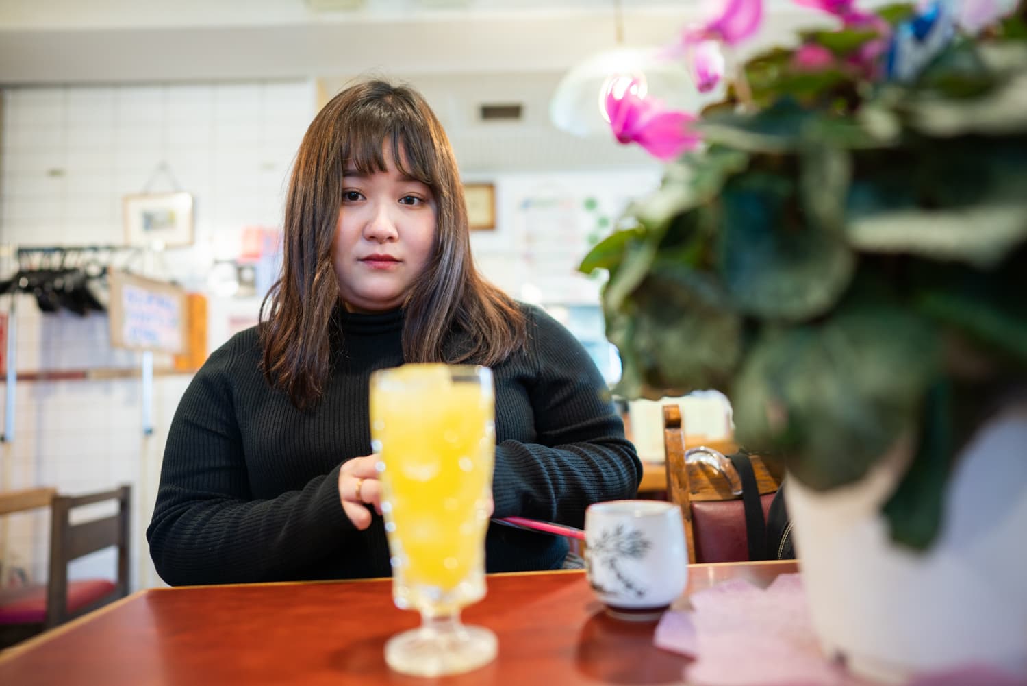 通り掛けに定食屋さんへ寄ると、テーブルの上にシクラメンの鉢がありました。